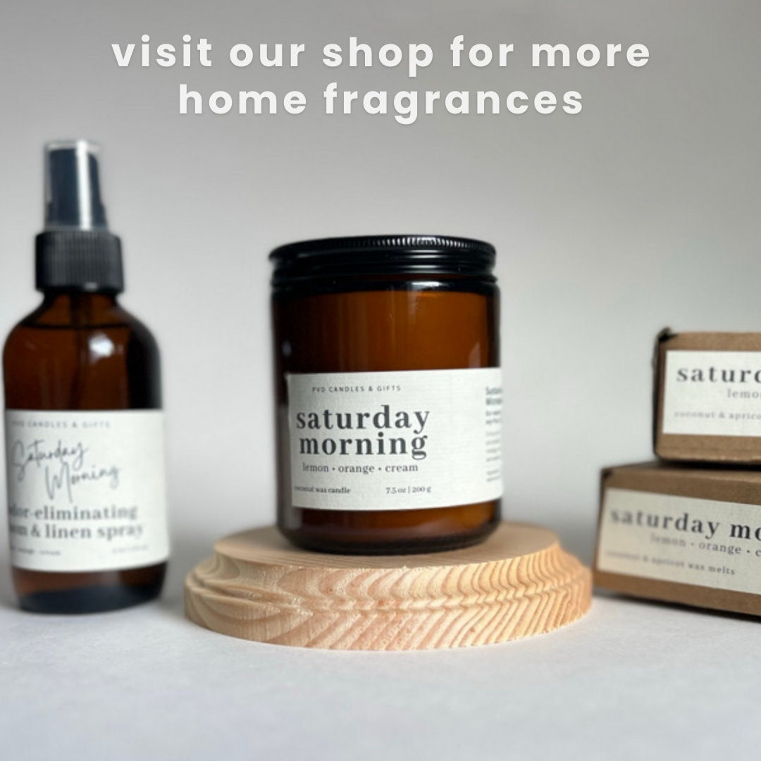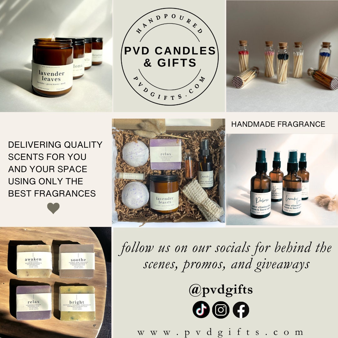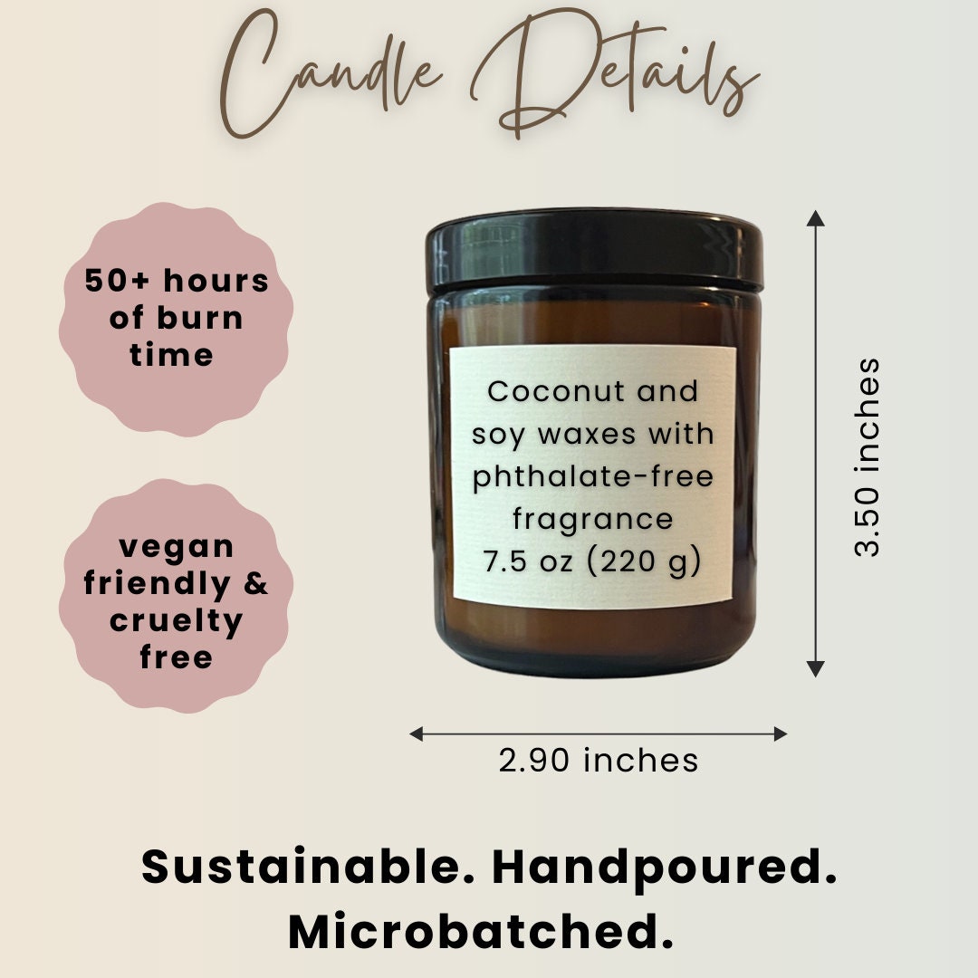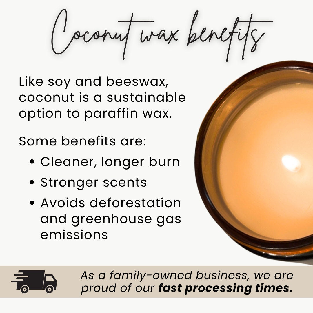 - One 8oz personalized coconut soy blend candle (50–55 hour burn time)